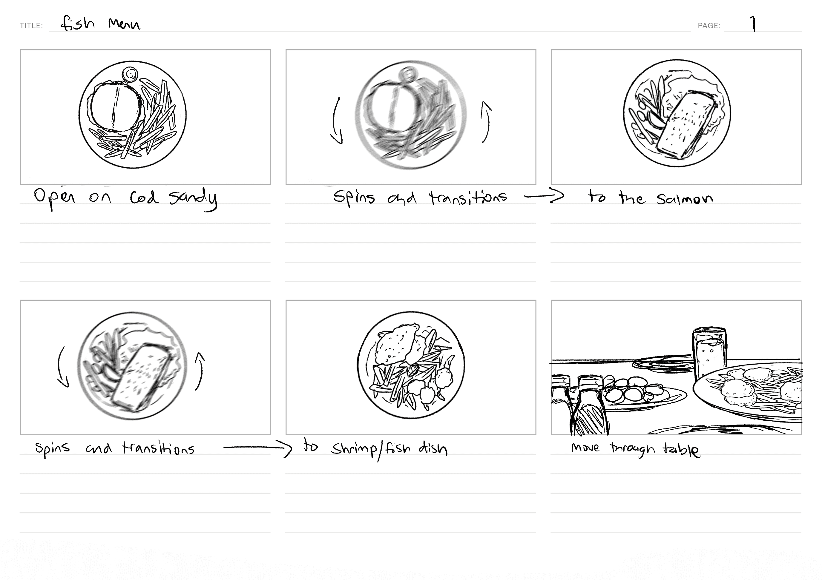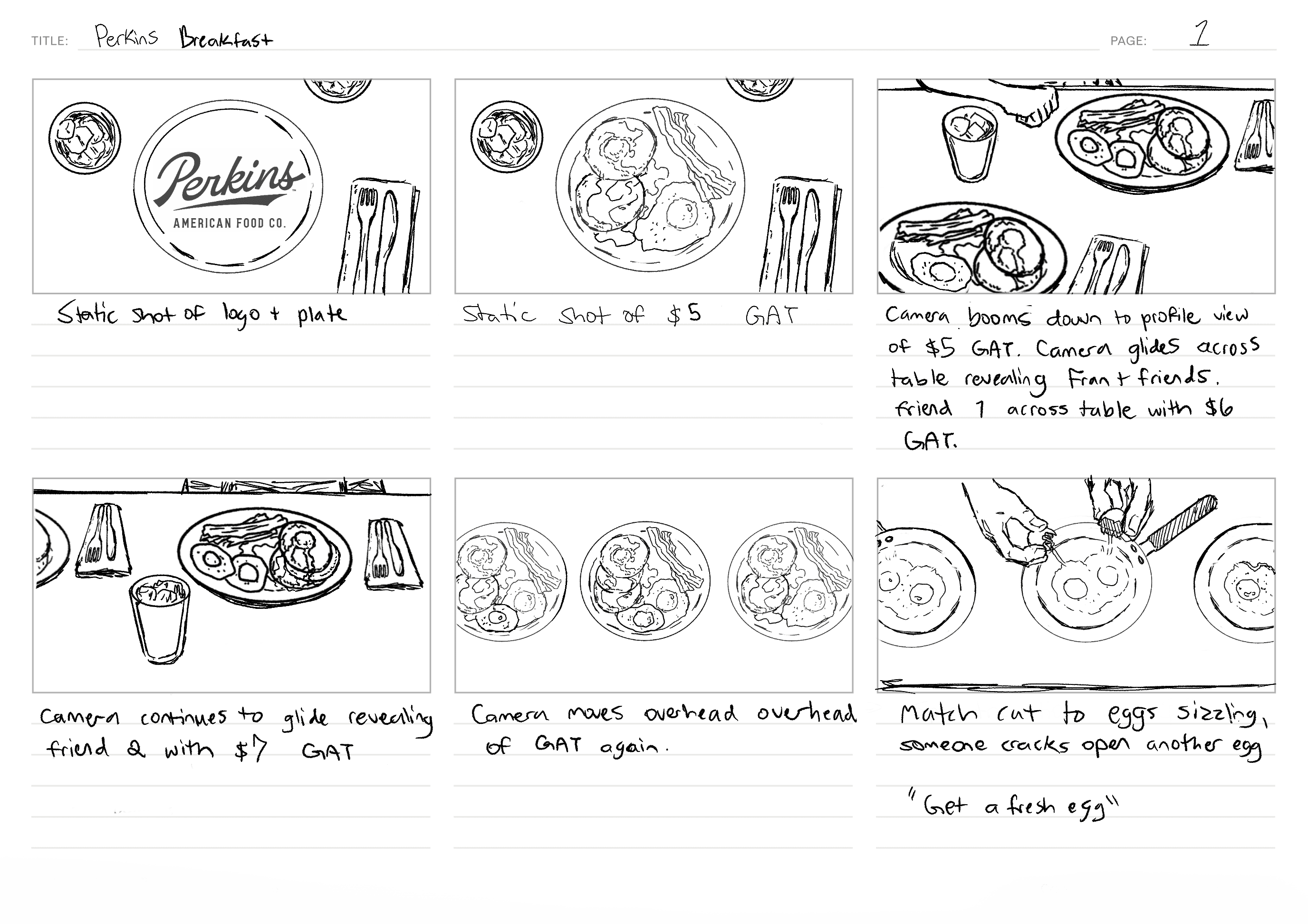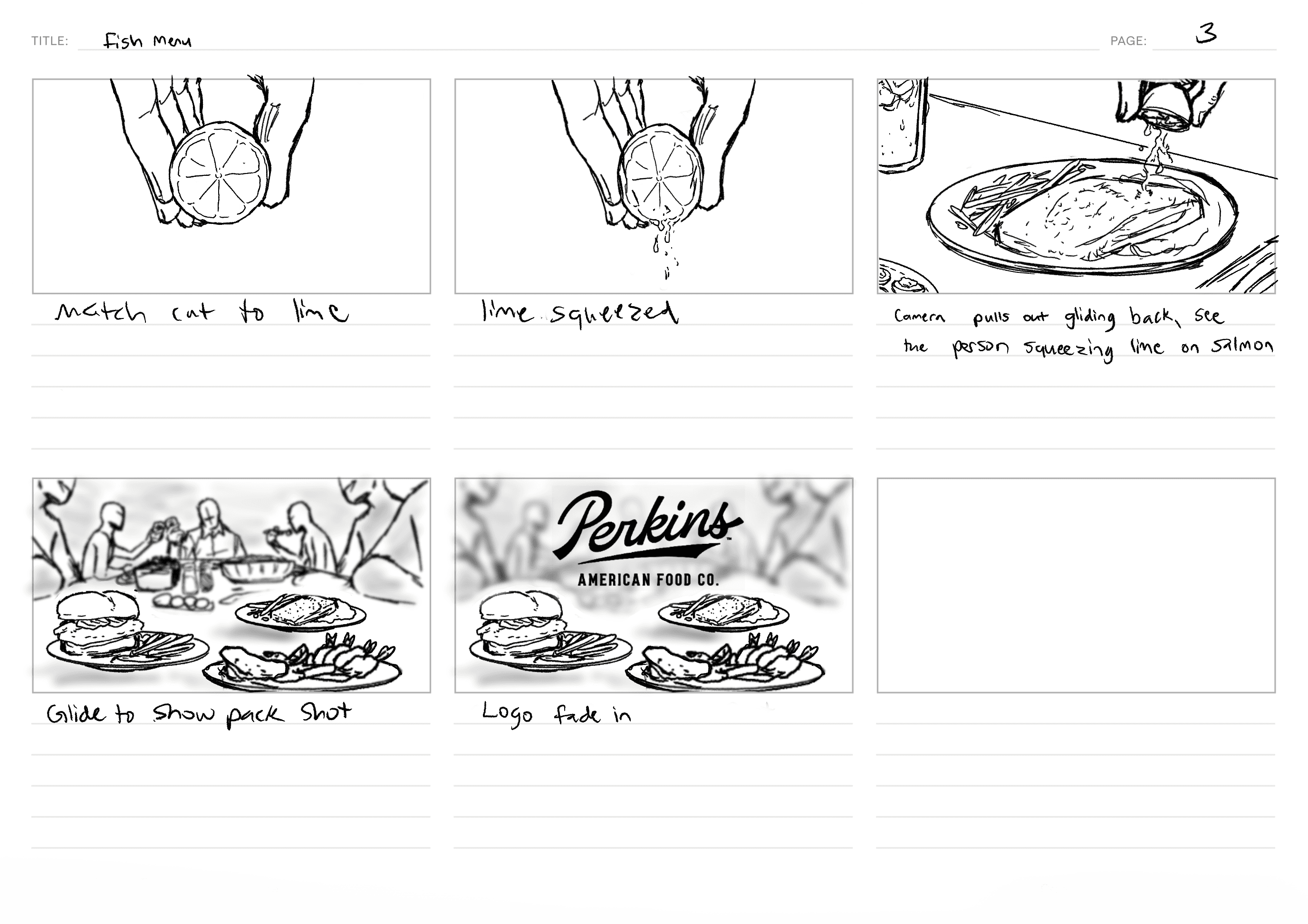 Storyboards for a film production company who worked to create two 15-second spot ads for the restaurant chain, Perkins American Food Co. They needed to be quick, snappy and dynamic but still with enough time to showcase all the food items they wanted to highlight; with an even quicker turnaround time.